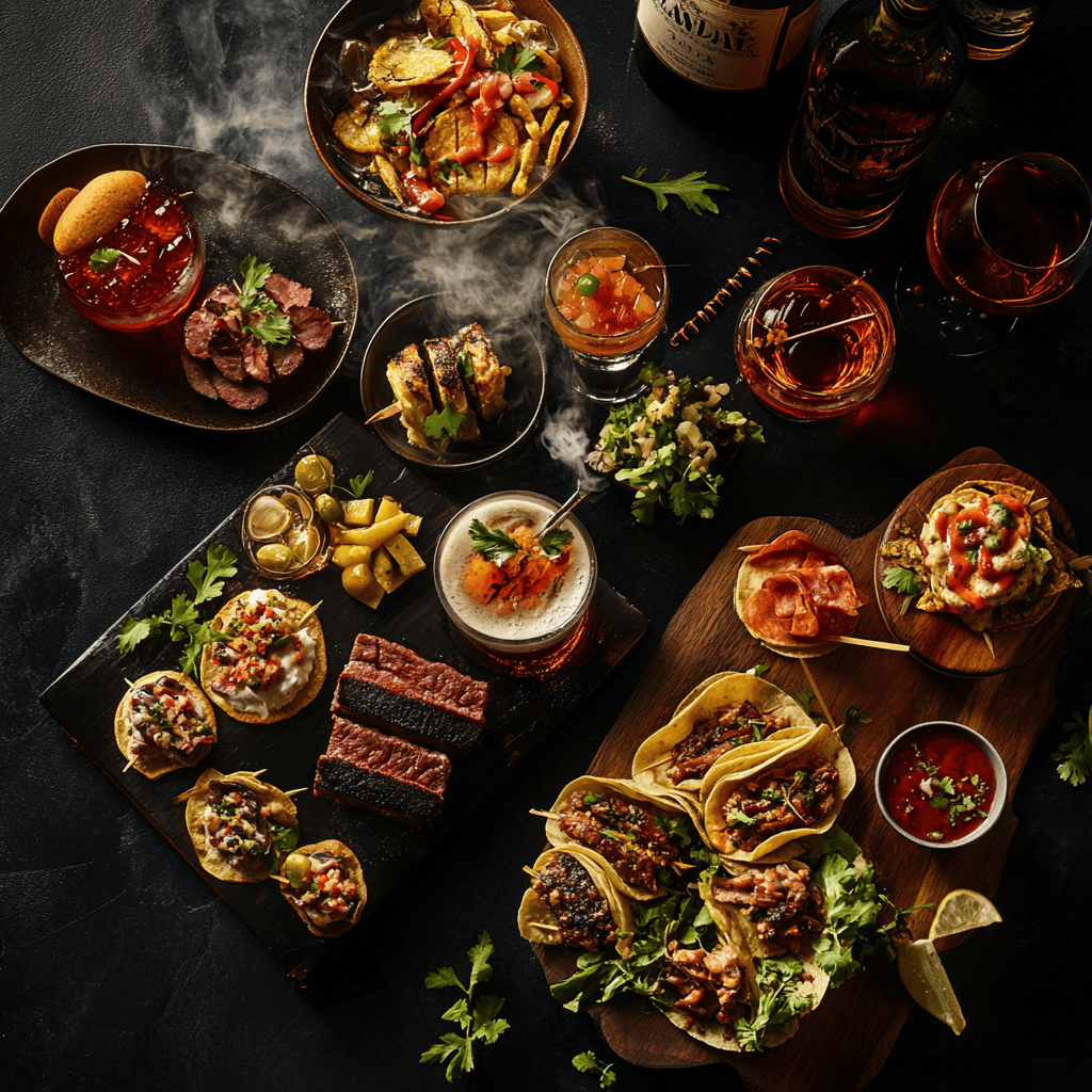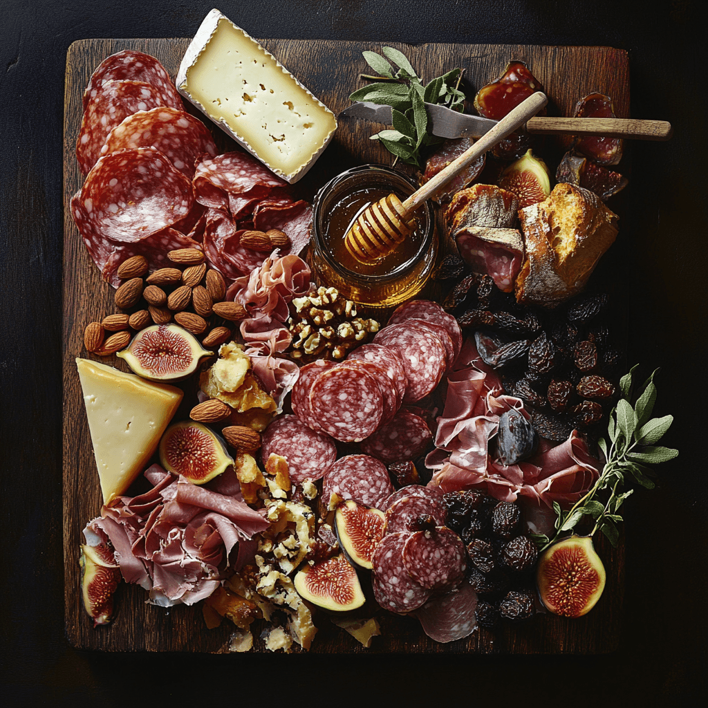 A REFINED SPREAD OF ARTISANAL CHEESES, FRUITS, NUTS, PROSCIUTTO, PEPPERED SALAMI, SEASONAL JAMS, AND ASSORTED CRACKERS
